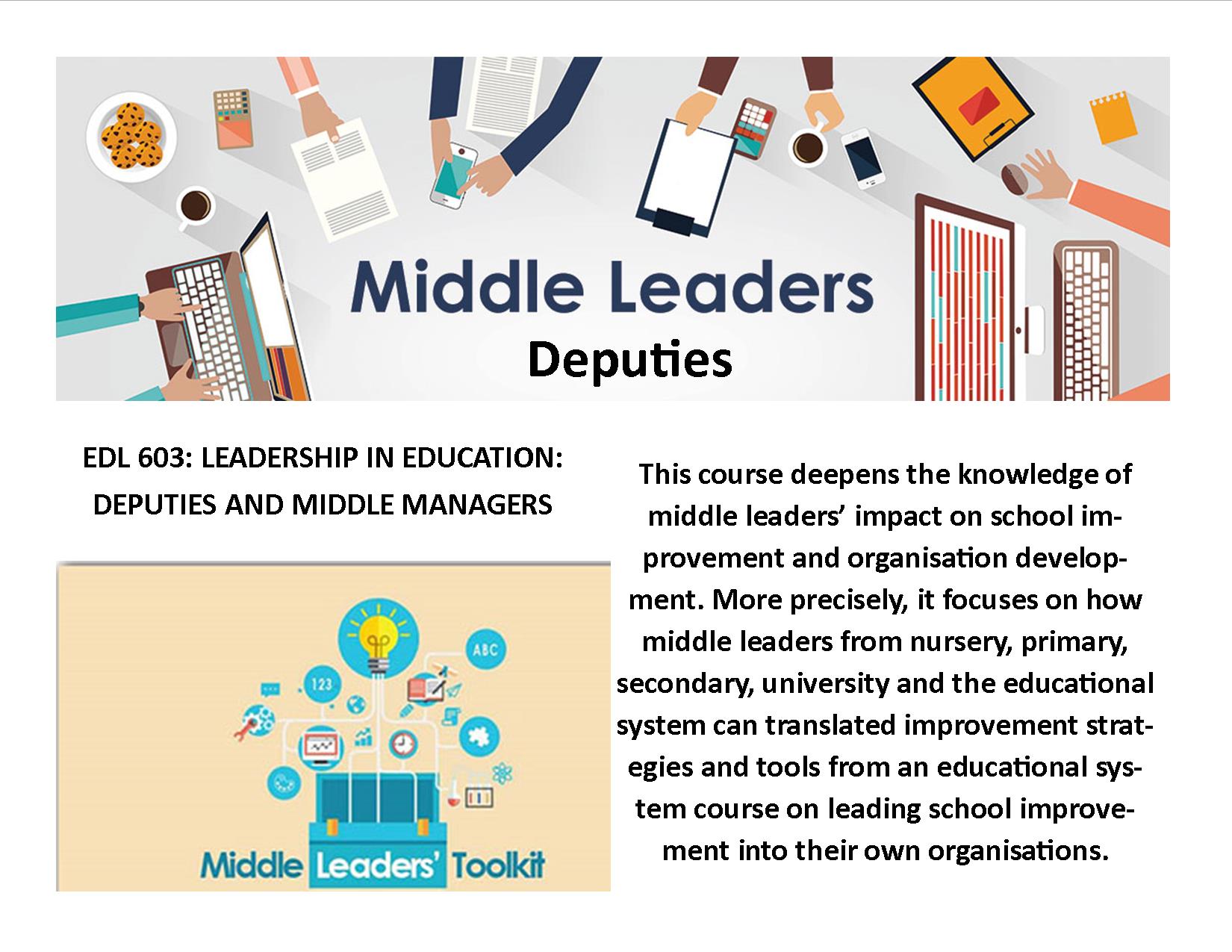 The programme is designed to provide participants with incrementally greater knowledge, skills and insights into Middle management and leadership in schools.